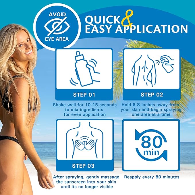 - LONG-LASTING SUN PROTECTION GREAT FOR ALL TYPES OF SKIN. Our 50 spf sunscreen spray comes in an 8.5 oz bottle, enough for several uses. To apply, wait 15 minutes before exposure, apply to all skin areas except the eye, and reapply every 80 minutes.