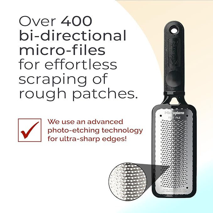 - SHOWER FOOT SCRUBBER OR DRY FOOT SCRAPER: The original stainless-steel Colossal Microplane foot file, proudly made in the USA, is a salon-quality pedicure foot file that helps you achieve soft, smooth feet naturally – either after soaking in water or while dry.