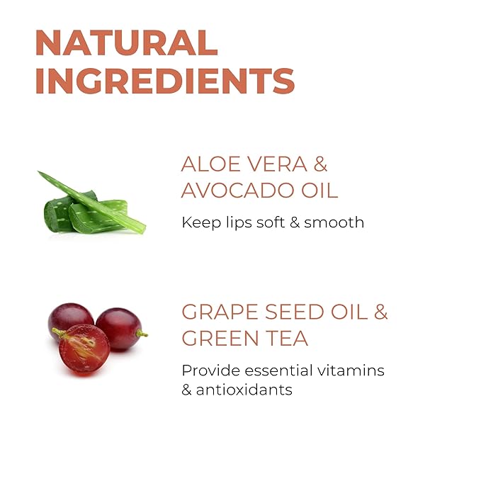- NATURAL INGREDIENTS - Aloe vera & avocado oil keep your lips soft and smooth, while grape seed oil & green tea extract provide essential vitamins and antioxidants to keep them protected and nourished.