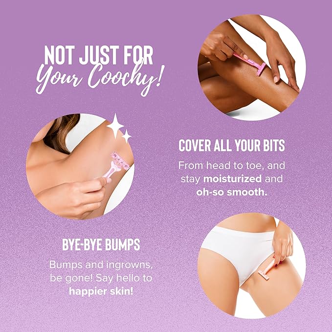 - GENTLE AND IDEAL FOR SENSITIVE SKIN: Coochy is safe to use anywhere on the body, including legs, arms, underarms, intimate areas, head, and even the face. The conditioner and moisturizing complex provides the perfect lubrication and razor glide. Jojoba Seed Oil provides a protective barrier for skin and helps seal in moisture.