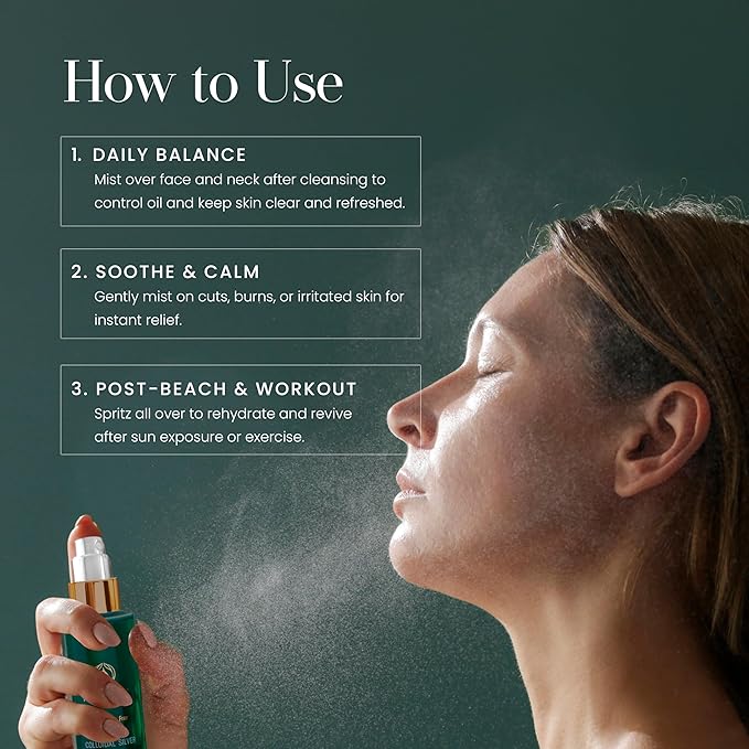 - πΏ Multi-Purpose Toner: Calm, soothe, and hydrate acne-prone and inflamed skin with our versatile Colloidal Silver Mist Toner. Suitable for face, body, and even after waxing to reduce irritations.