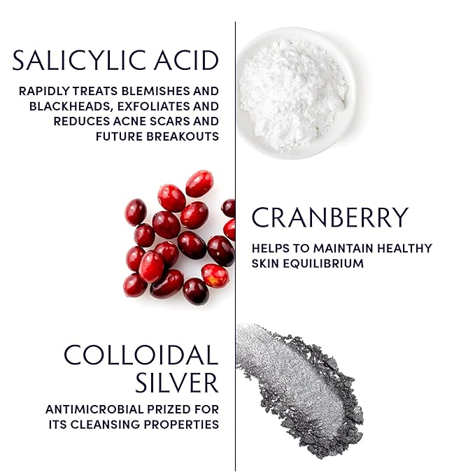 - Clarifying Face Cleanser: 2% Salicylic Acid rapidly remedies blemishes and blackheads; works as a gentle face exfoliator and helps reduce acne scars and future breakouts; Colloidal silver is prized for its cleansing properties; while Cranberry helps to maintain healthy skin equilibrium.