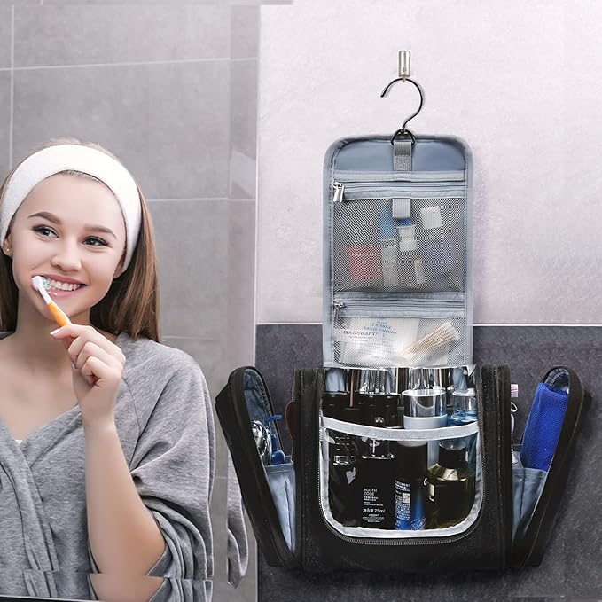 - - Keep Everything Organized: Inner pockets with elastic straps hold bottles upright. Two side pockets of the travel toiletry bag can keep the wet and dry items separated. The right side pocket with PVC material is easy to clean and dry, perfect for makeup brushes, toothbrushes,and wet towels. The stow-away 360-degree swivel non-slip metal hook allows for versatile hanging options
