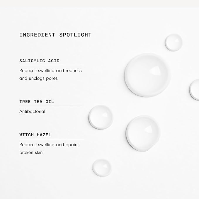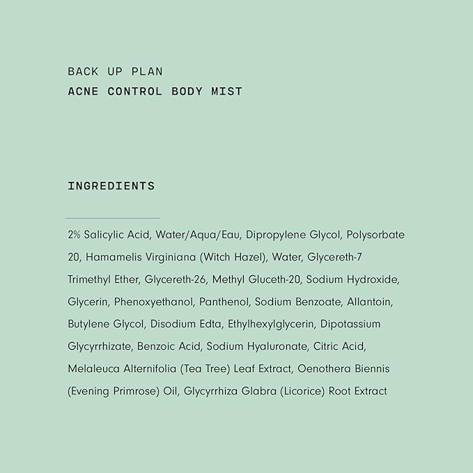 - Ingredients - Its 360-degree continuous body spray (which comes in a non-aerosol bottle) gets hard-to-reach spots using 2% salicylic acid, witch hazel, and tea tree oil. The combination calms inflammation, fights bacteria, controls oil, and soothes redness.
