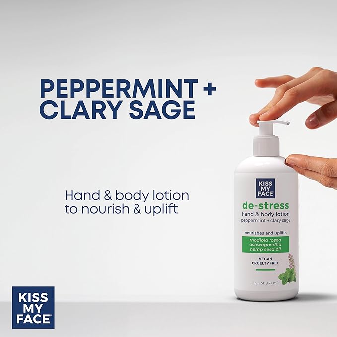 Kiss My Face De-Stress Hand & Body Lotion - Peppermint + Clary Sage - Soothing Rhodiola Rosea - With Hemp Seed Oil & Ashwagandha - Vegan & Cruelty-Free - 16 fl oz Bottle