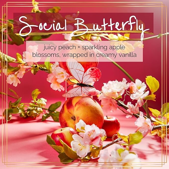 - SCENT NOTE, CLEAN BEAUTY, & UNCOMPROMISING QUALITY - Our Social Butterfly scented body lotion comes with a juicy peach + sparkling apple blossoms, wrapped in creamy vanilla. Unlike other body moisturizers, our hyaluronic acid moisturizer is clean beauty—vegan, cruelty-free, &, SLS & SLES-free. Female-founded & 100% made in the USA.