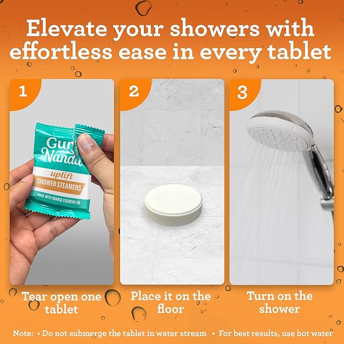 - LONG-LASTING LUXURY, TWICE OVER: Our GuruNanda Uplift Shower Steamer Tablets (Pack of 10) are crafted with the highest quality 100% pure and natural essential oils sourced globally. These tablets offer a luxurious aromatic escape, and the unique feature of each tablet being easily split into two parts ensures you can enjoy two extended aromatic journeys for a remarkably long time.