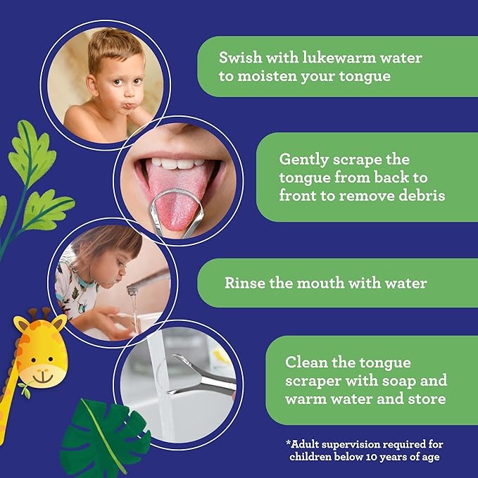 - PREMIUM STAINLESS STEEL FOR DURABILITY: Made from high-quality 420 medical-grade stainless steel. GuruNanda's Kids' Tongue Scraper ensures longevity and a secure, non-slip grip designed for little hands.