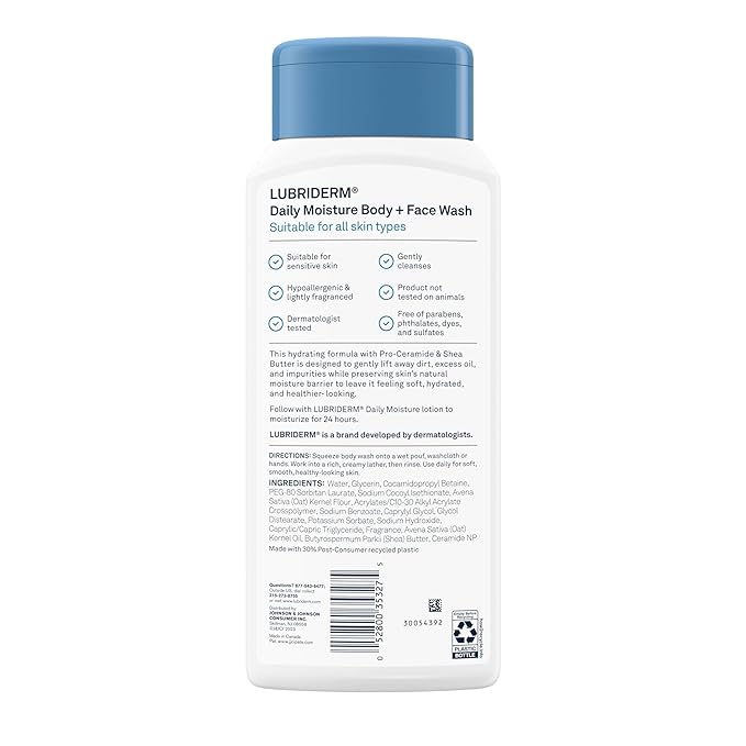 - 16-fluid ounce bottle of Lubriderm Daily Moisture Body + Face Wash, lightly scented hydrating body wash & moisturizing facial cleanser with Pro-Ceramide & shea butter to gently cleanse & help preserve skin's natural moisture barrier