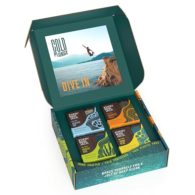 Every Man Jack Cold Plunge Mens Bar Soap Set - Deeply Cleans, Hydrates with Naturally Derived Ingredients - Iconic Cold Water Scents - Pacific Dive, Glacier Bay, Tahoe Blue, Yosemite Falls, 4 Bar Set