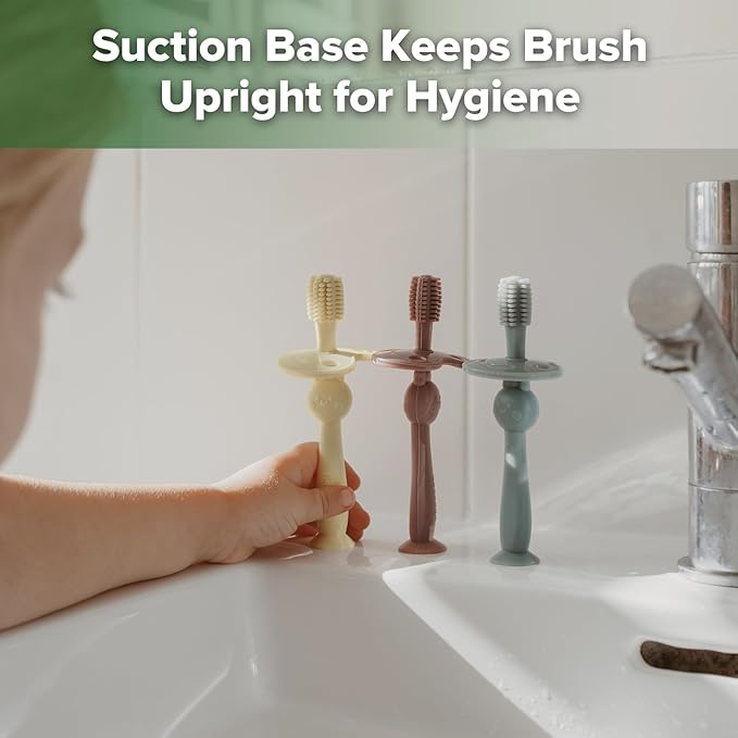 - INSTILL EARLY ORAL HYGIENE ROUTINES: The Haakaa 360° baby toothbrush with suction base is the perfect first toothbrush to set up good brushing habits from an early age. Suitable to use even before baby’s first teeth emerge.