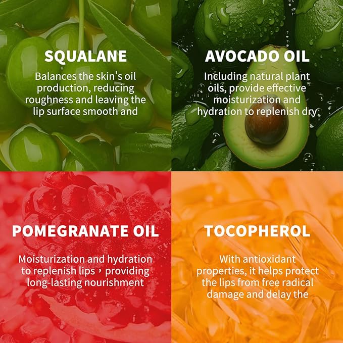 - [ Natural Ingredients ] Infused with avocado oil, and pomegranate oil, which provide nourishment and hydration while keeping your lips healthy.