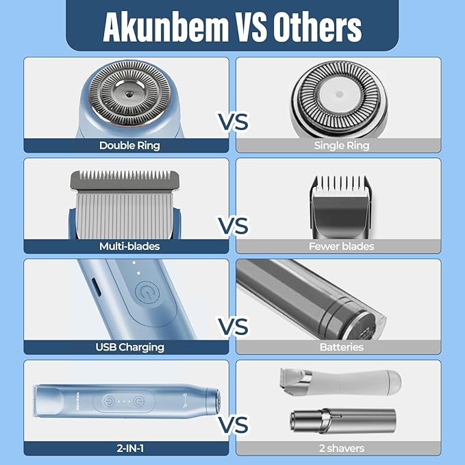 - Versatile Grooming Kit: Akunbem women electric shaver features an innovative dual head design that combines the functions of a body and facial shaver in one. There is no need to change the cutter head frequently. It can accurately and smoothly remove hair from the face, body and sensitive areas.