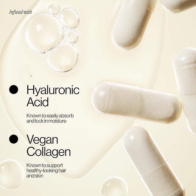 - Key Ingredients: Infused with a blend of low and high molecular weight hyaluronic acid, known to easily absorb and lock in moisture; Vegan collagen which is known to support healthy-looking hair and skin