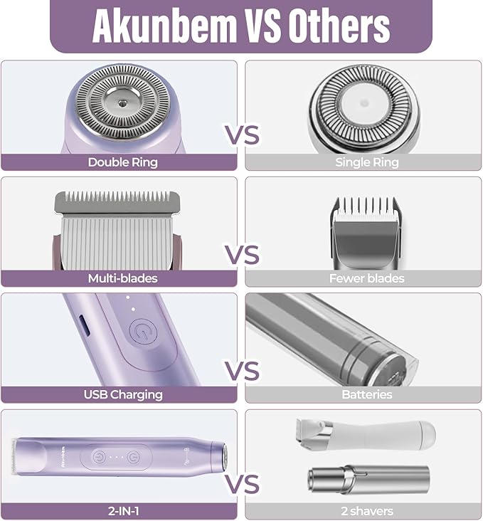 - Versatile Grooming Kit: Akunbem women electric shaver features an innovative dual head design that combines the functions of a body and facial shaver in one. There is no need to change the cutter head frequently. It can accurately and smoothly remove hair from the face, body and sensitive areas.