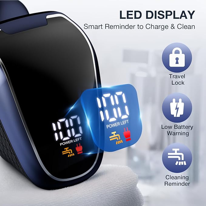 - LED Intelligent Display: The bald head shaver for men with LED display can accurately show the percentage of the battery power. Low battery reminder, water washing reminder more intelligent. Long press the switch button for 3 seconds to trigger the travel lock to avoid additional power consumption. This electric shaver uses 600mAh large capacity battery, 2 hours of fast charging can provide 60 minutes of working time. Please charge it in time for regular use