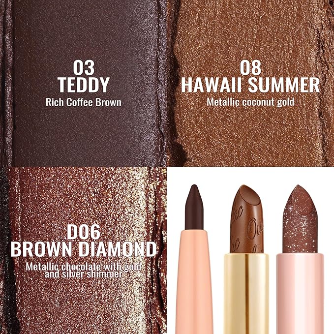 - Metallic Shine Lipstick: High-pigment metallic lipstick with dense glitter for bold shimmer or subtle shine. Infused with Vitamin E and castor oil for hydration. Perfect for festive or daily looks.