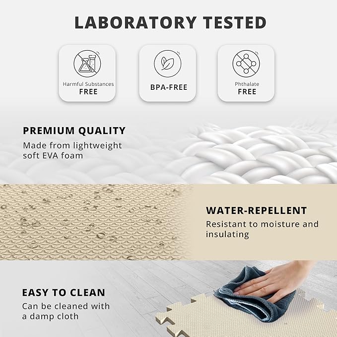 - 💪 𝗛𝗜𝗚𝗛-𝗤𝗨𝗔𝗟𝗜𝗧𝗬, 𝗗𝗨𝗥𝗔𝗕𝗟𝗘, 𝗥𝗘𝗟𝗜𝗔𝗕𝗟𝗘 - the highly compressed, environmentally friendly, non-toxic EVA foam with anti-slip surface is perfect as floor layering for fitness and gym spaces, under sports equipment, work spaces, garages, basements and more. The mat's premium lightweight material also makes it noise- and impact-dampening, warmth-insulating, waterproof, long-lasting and easy to clean with soap and water.