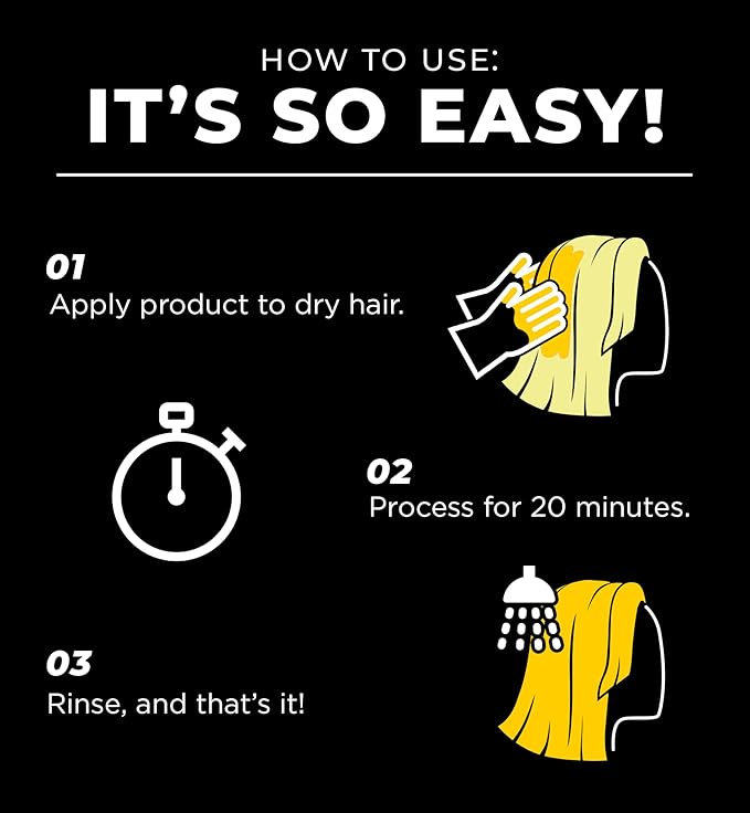- HOW TO USE: Apply to clean, dry hair with gloves, comb through to evenly saturate hair. Process for 20 minutes. Rinse thoroughly. That’s it!